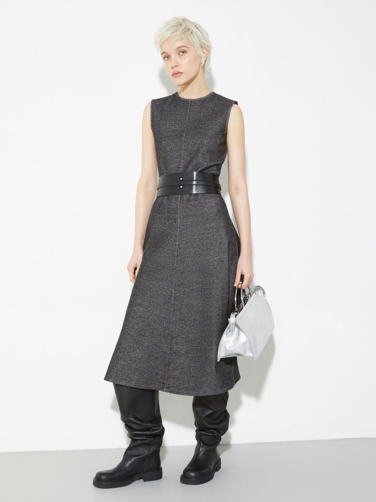 An overtly feminine fit-and-flare cut is crafted from a comfortable, stretchy jersey and finished with a traditional tailoring-style micropattern.
