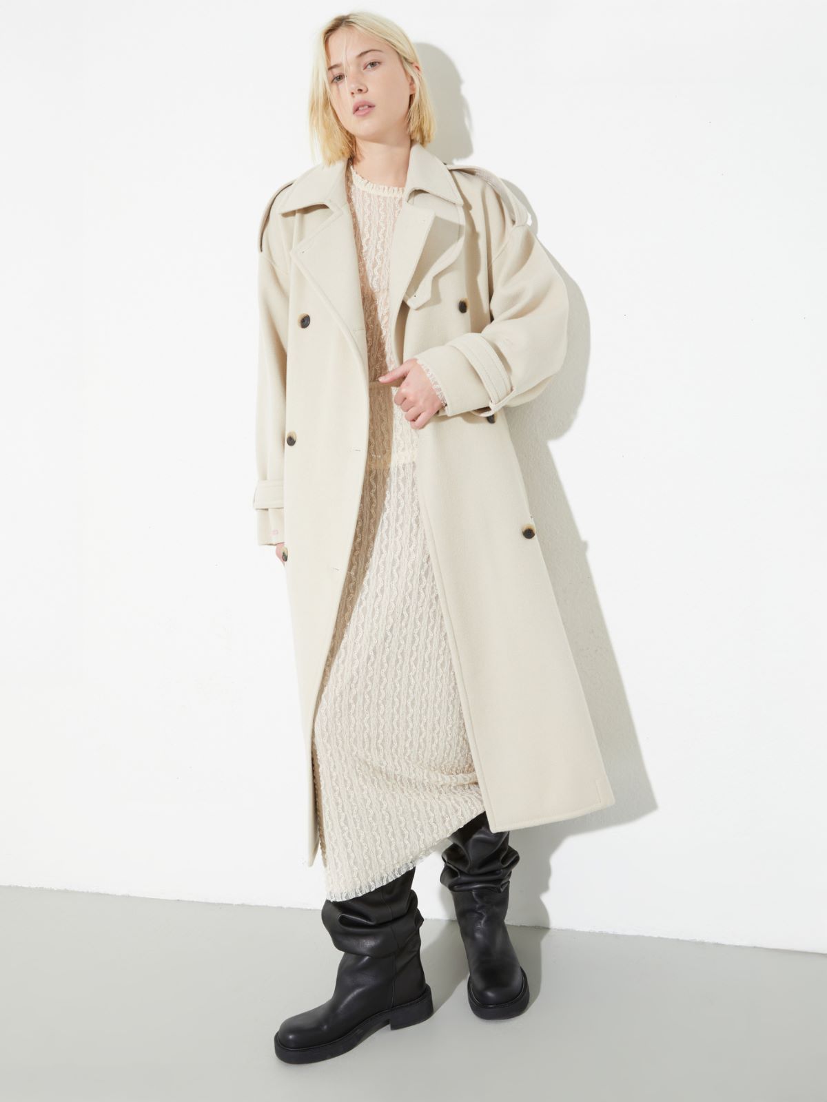 The classic trench coat experiments with a new, oversized silhouette this season, spun from double-woven wool for signature MAX&Co. style.
