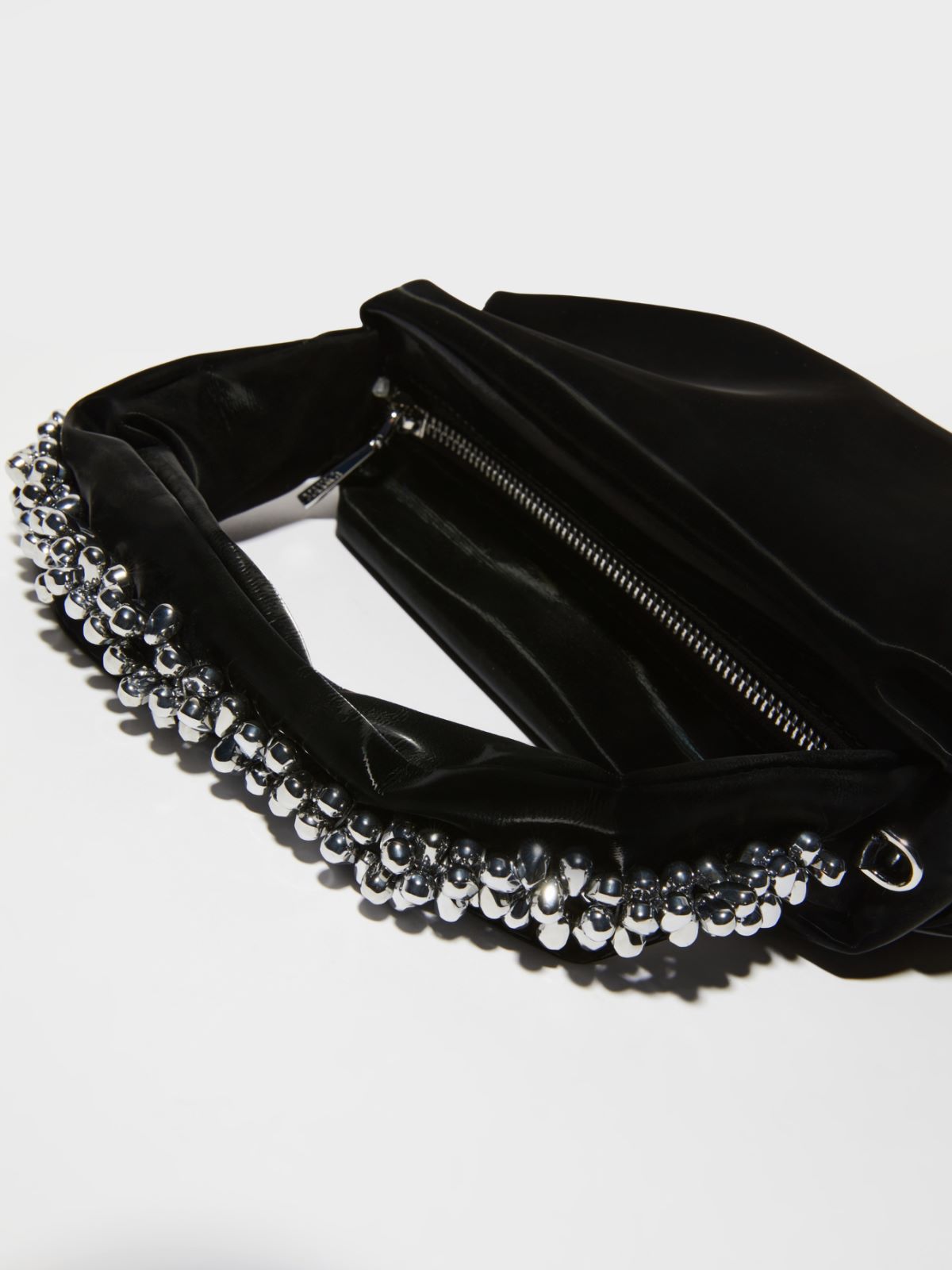 A glossy, pouch-style bag is made all the more eye-catching with seashell-inspired, jewelled charm embroidery across its handle.