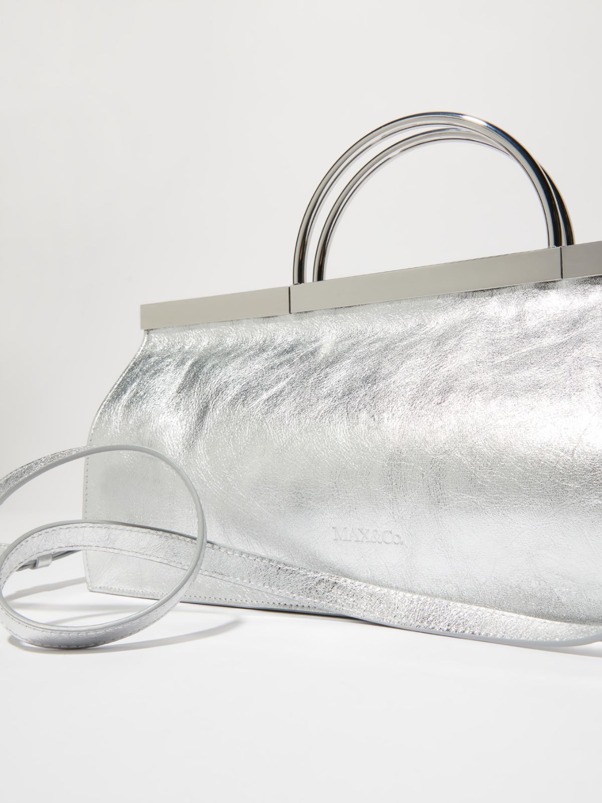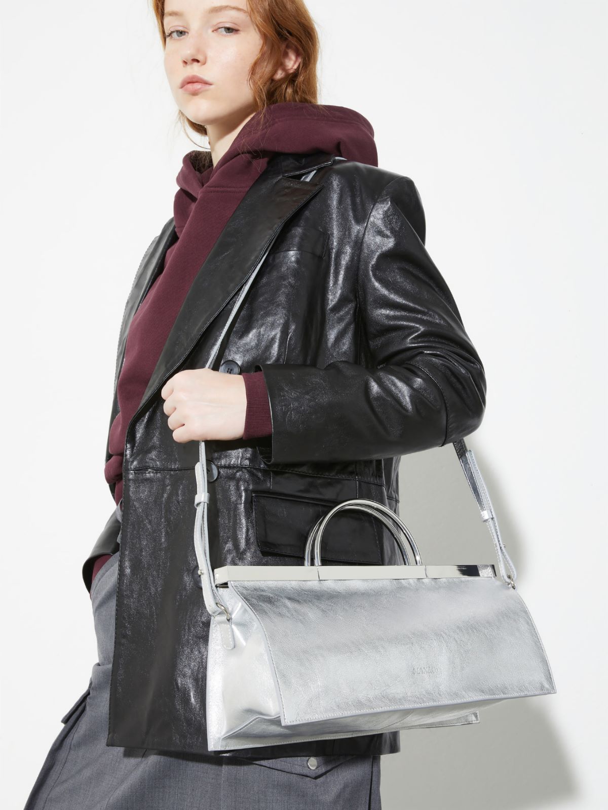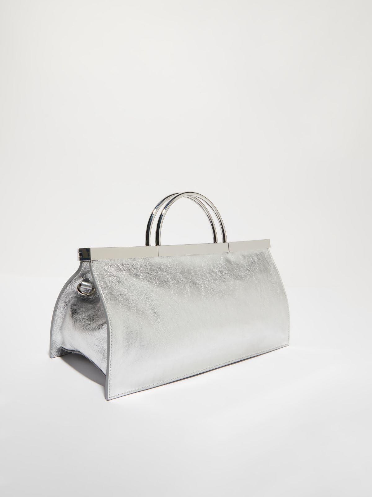 This bag’s bold, angular silhouette is accentuated by smooth leather in a shimmering metallic finish and glossy metal detailing.