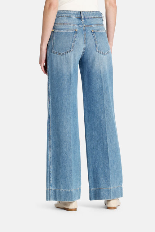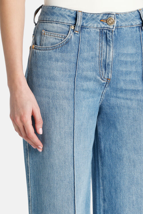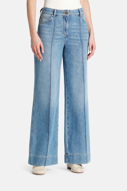 Wide leg jeans with a five-pocket design, decorative raised seams, and a wide stitched hem. Regular fit.