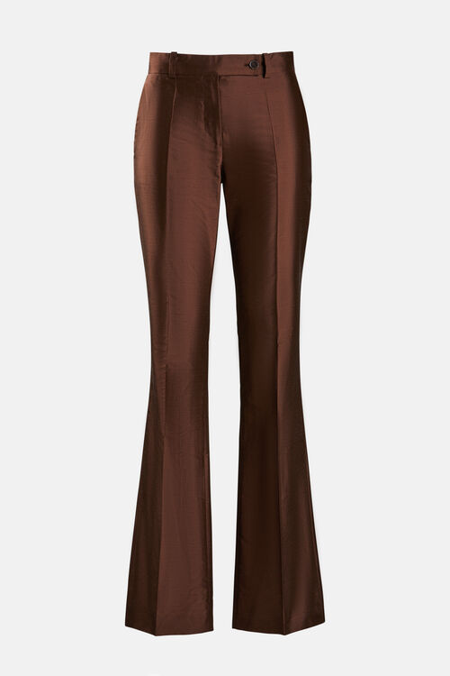 Shantung silk trousers featuring a classic straight leg and pressed crease. Regular fit. Fashion Show