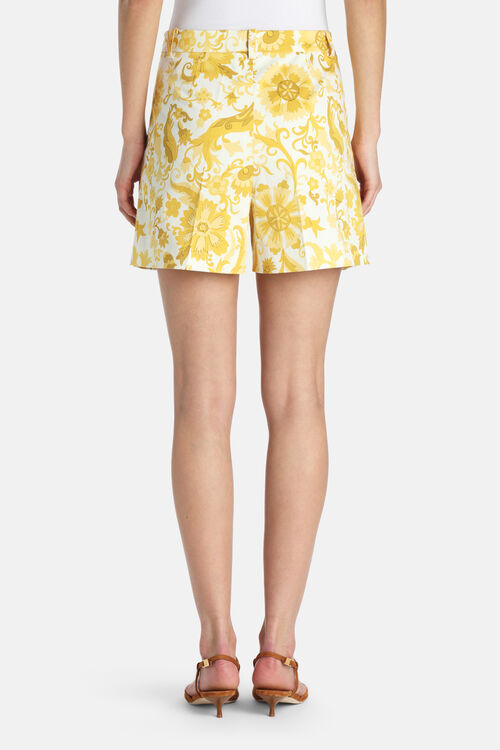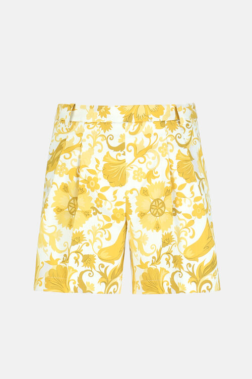 Pure cotton Bermuda shorts with pleats, featuring a stylised floral motif. Designed with belt loops, side pockets, and a side zip fastening. Regular fit.