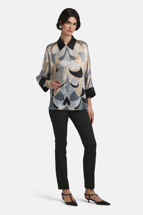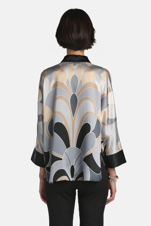 Printed silk satin shirt with a geometric foliage motif, a contrast collar, and open-finish sleeves. Regular fit.