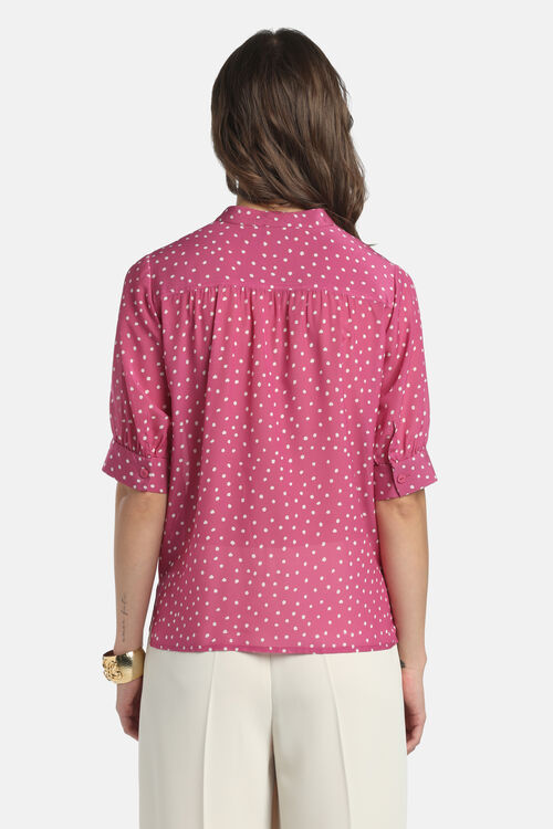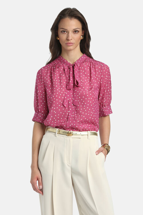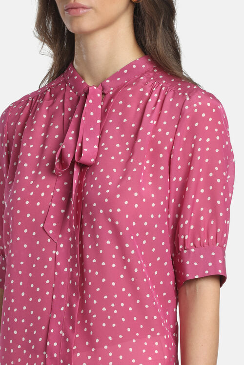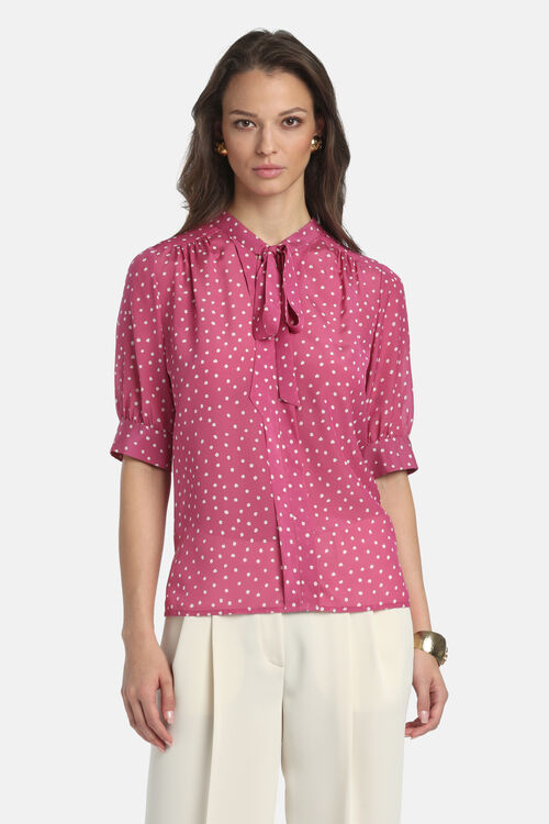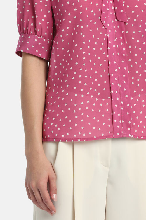 Silk-blend crêpe de Chine blouse with a slim plastron and tie collar, half sleeves with wide cuffs, and an irregular polka-dot print. Regular fit.