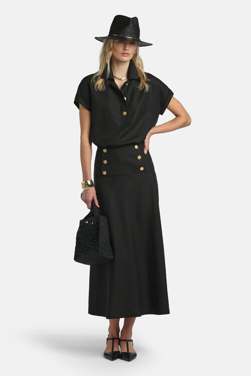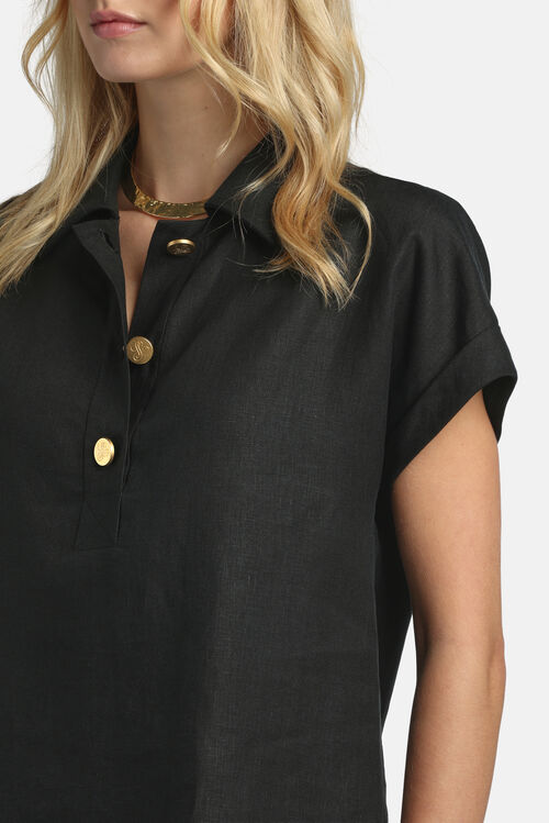Pure linen shirt with a polo collar, embellished with „LS“ signature gold-tone buttons with a matte finish. Features a half placket, cap sleeves with turn-ups, and a straight cut hem with side slits. Regular fit.