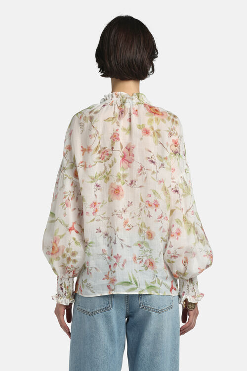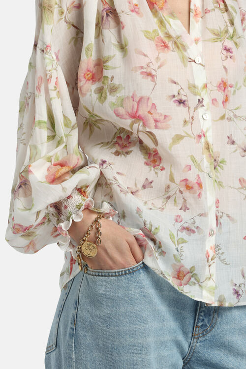 Floral-print ramie shirt with smocked band collar and smocked cuffs, gathered details, V neckline, and wide puff sleeves. Regular fit.