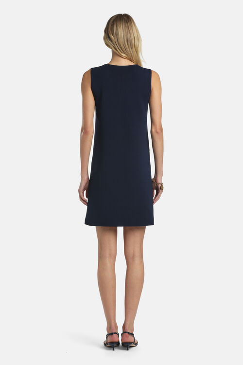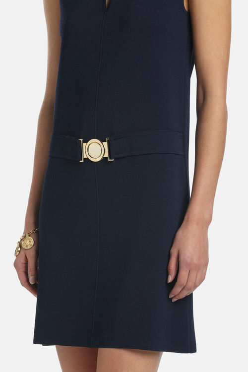 Sixties-inspired minidress with an A-line silhouette, crafted from viscose-blend textured knit. Sleeveless design with a round neckline featuring a central slit, a centre-front seam, and an integrated belt with metal hardware. Above-the-knee length. Regular fit.