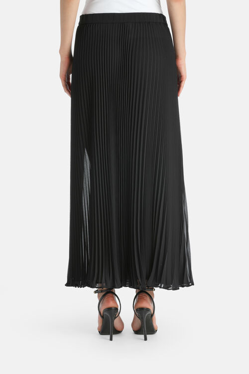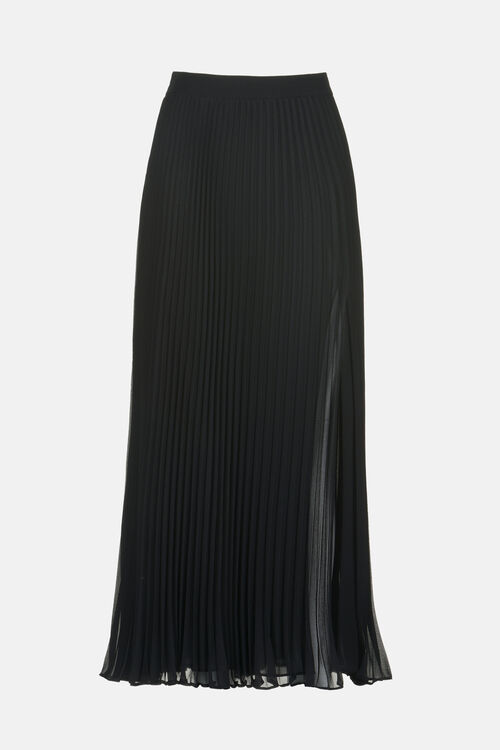 Elegant pleated maxi skirt with a high slit, smooth waistband, and inner lining. Invisible side-zip closure. Regular fit.