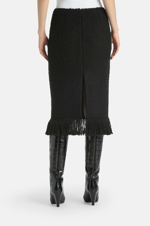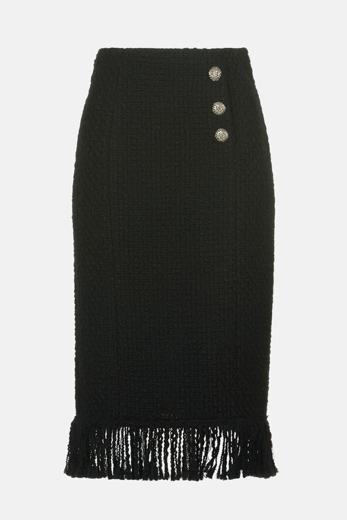 Wool-blend bouclé midi skirt, featiring circular metallic buttons, back slit, rear invisible zip closure, fringed hem. Below-the-calf length. Regular fit.