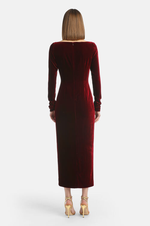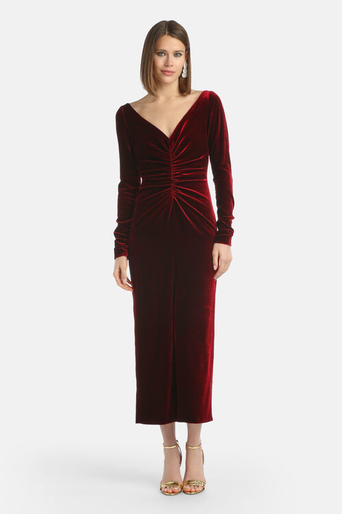 Elegant maxi dress in viscose-blend velvet. Features a deep V-neck with ruched bust to enhance the silhouette, fitted sleeves, front slit, and an invisible zip closure. Ankle length. Regular fit.