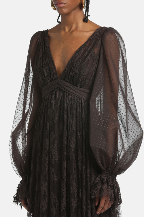 Lace gown with semi-transparent plumetis tulle sleeves. It features an empire waist with deep V-neck on front and back, puff sleeves with flounced cuffs, back bow, soft-cut skirt with contrasting fabric flounce. Floor length. Regular fit. Fashion Show.