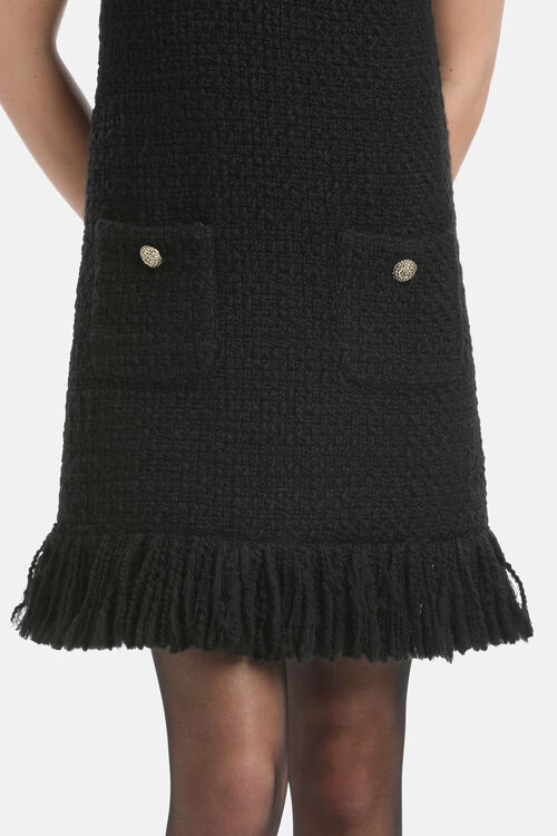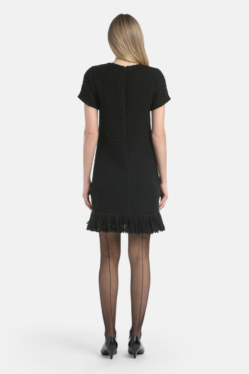 Short bon ton minidress made of bouclé wool. The dress features a round neckline, short sleeves, patch pockets, decorative metal button, fringed hem, invisible back zip closure. Above-the-knee length. Regular fit.