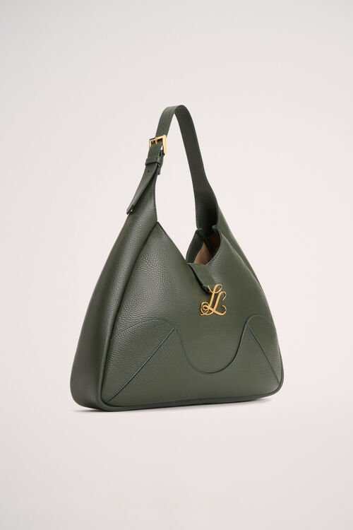 Shoulder bag in genuine tumbled leather. Adjustable handle fastened to both sides, decorative intarsia, magnetic snap closure, gilded metal „LS“ detail. Made in Italy.