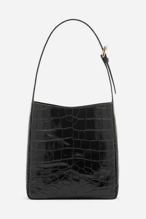Structured shoulder bag crafted from rich glossy crocodile-embossed leather. Features a flat handle adjustable with a buckle, front “LS” metal appliqué, and an internal zip pocket. Made in Italy.