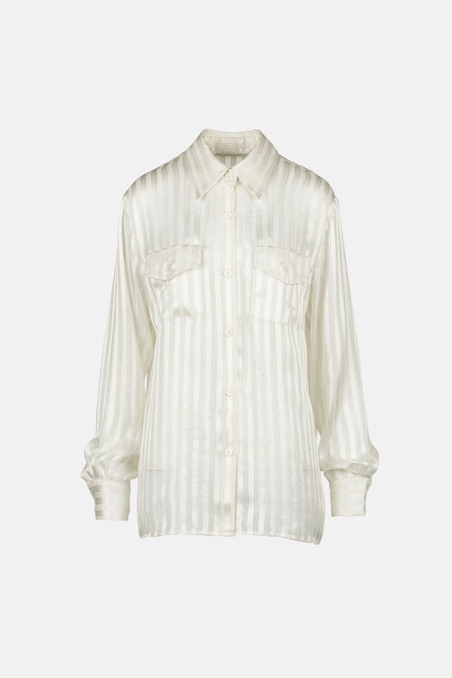 Silk shirt with a pinstripe pattern enriched by lurex thread. Features a classic collar, flap chest and pockets with buttons. Regular fit. Fashion Show