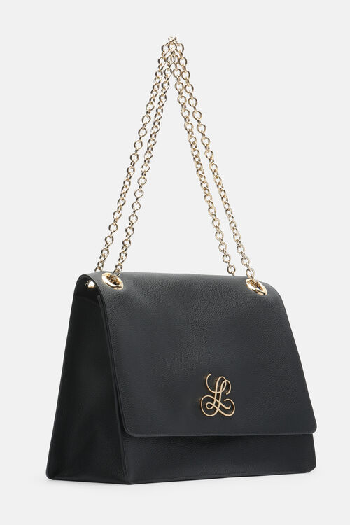 Genuine suede shoulder bag with gold chain. Combining capacity and lightness, it is perfect for any occasion. The chain allows it to be worn across the body, with timeless elegance. Metal snap button closure, lined interior with central compartment. Gold metal “LS” logo on the front. The name celebrates the brand’s birth date, 1928. Made in Italy.