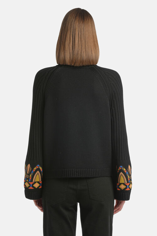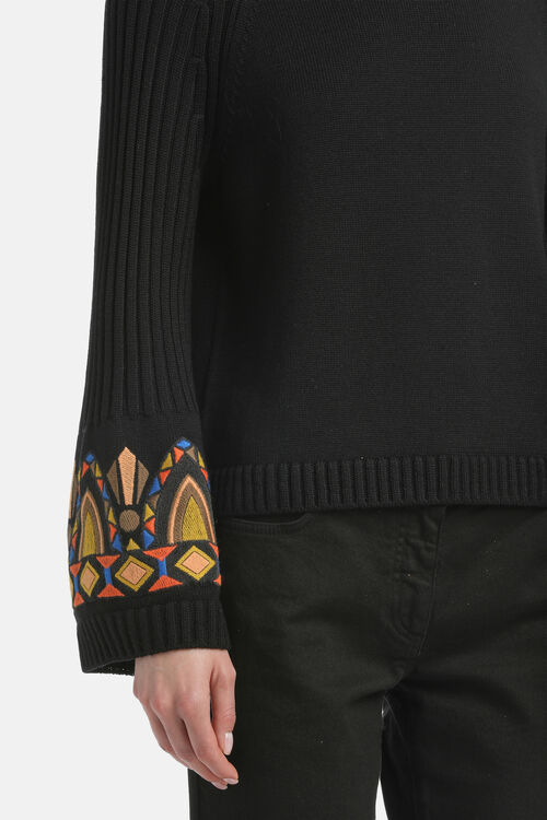 Pullover in pure virgin wool knit with mock neck, meticulous embroidery at cuffs, ribbed details. Regular fit