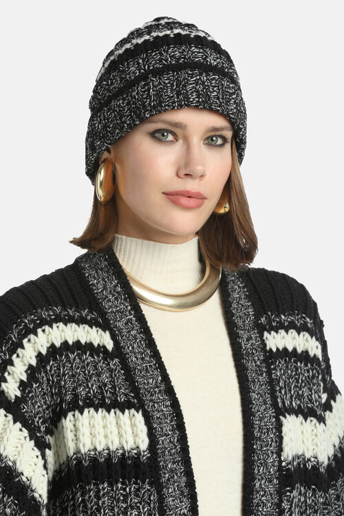 Beanie hat in wool blend. Striped pattern created with solid and mélange yarn. With turned-up brim. Made in Italy.