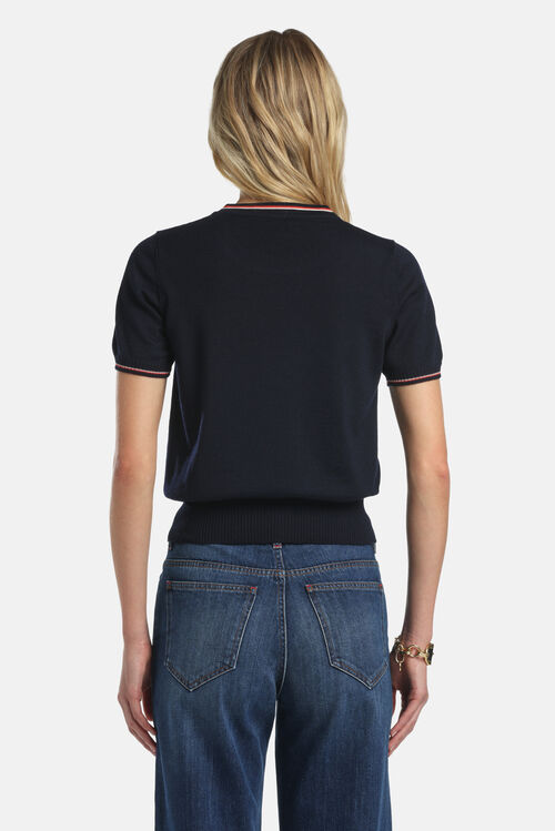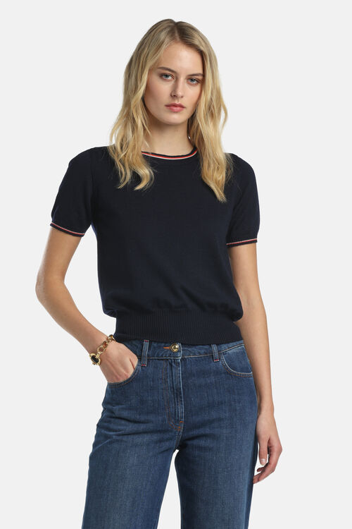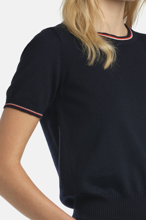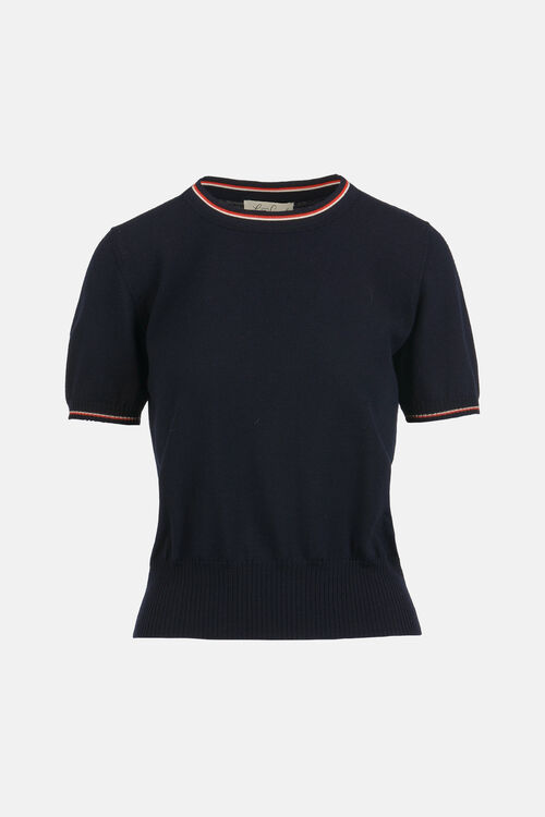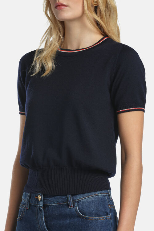 Stockinette-knit pure virgin wool top with striped accents, a round neckline, short sleeves, and rib-knit trims. Regular fit. Made in Italy.