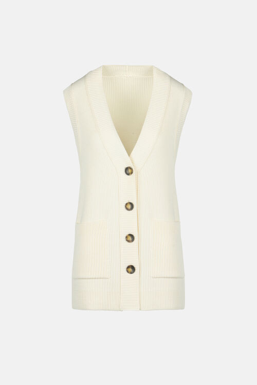 Long sleeveless cardigan in ribbed pure virgin wool, featuring contrasting trim along the armholes and button placket. Deep V-neckline, horn buttons. Regular fit.