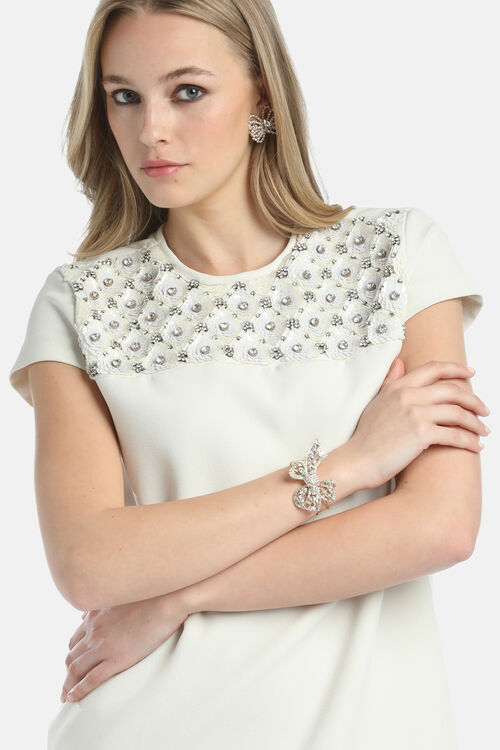 Gilded brass cuff bracelet enhanced with a crystal-encrusted bow appliqué. Made in Italy.