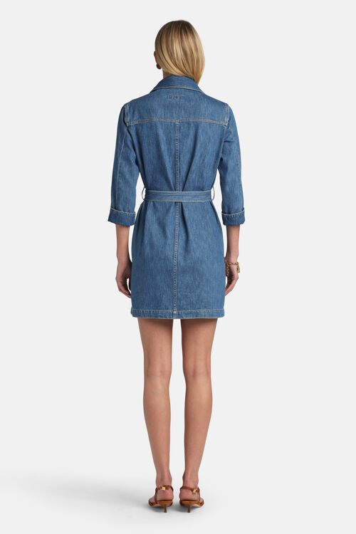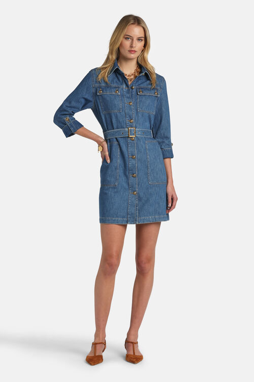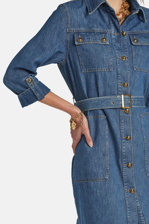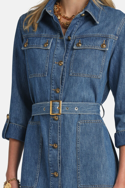 Cotton-denim shirtdress minidress with patch pockets, heraldic buttons, an integrated belt with a gold-tone buckle, and 3/4 sleeves with fixed turn-ups and tabs. Above-knee length. Regular fit.