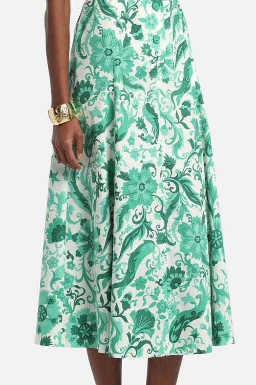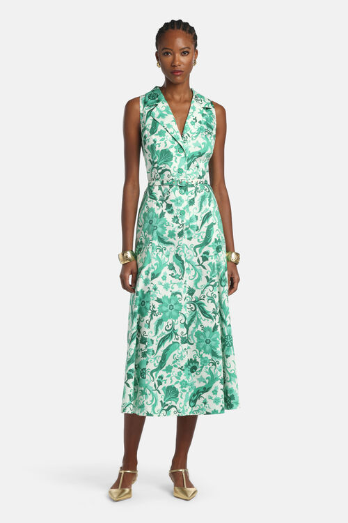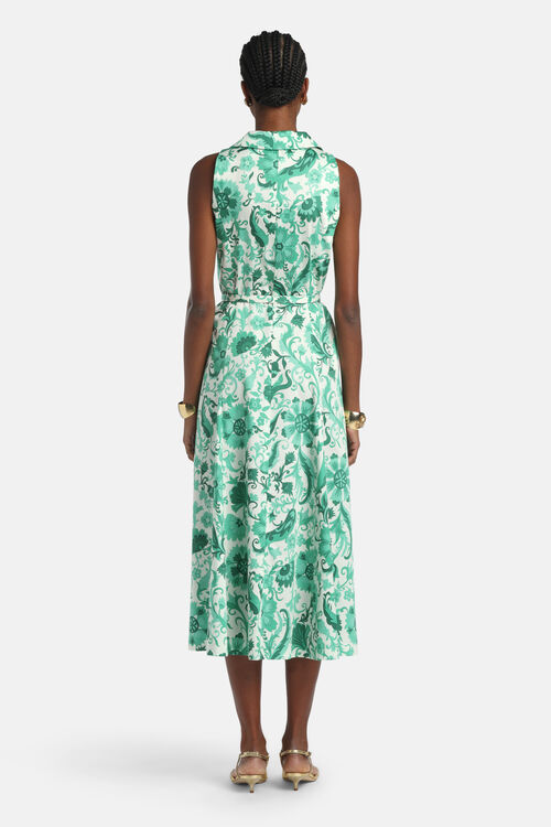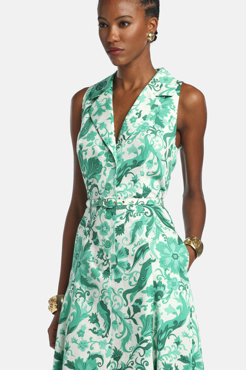 Sleeveless maxi dress in pure cotton with a tonal floral print. Shirt-dress silhouette with a halterneck-inspired shoulder cut, lapels, and tonal buttons, finished with an integrated waist belt and side pockets. Fluid hemline. Calf-length. Regular fit.
