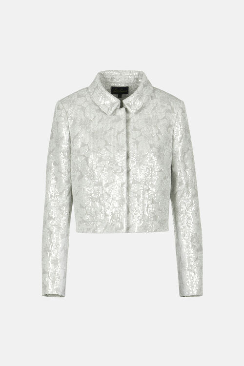 Elegant cropped blazer embellished with a floral motif made of micro-sequins. Features a Peter Pan collar, concealed button placket, and small patch pockets. Regular fit.