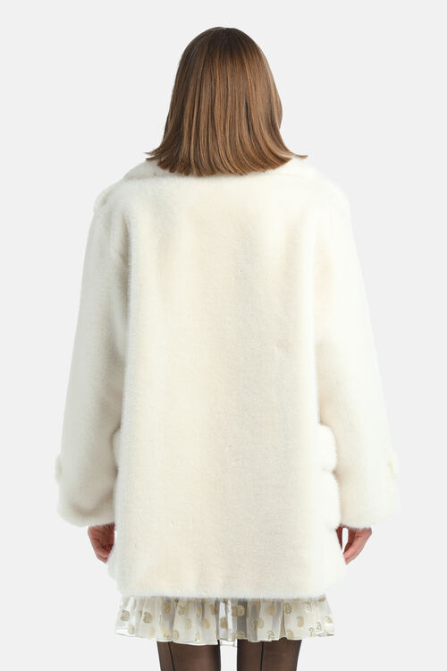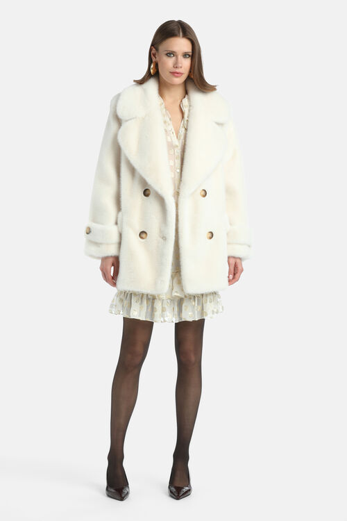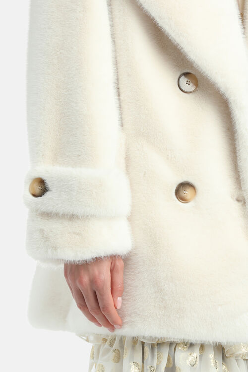 Generously cut peacoat in soft faux fur. Double-breasted closure with four buttons, sleeve cuff straps, side pockets. Regular fit. Fashion Show