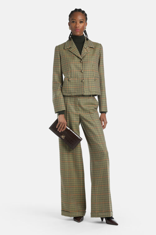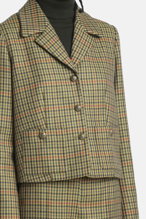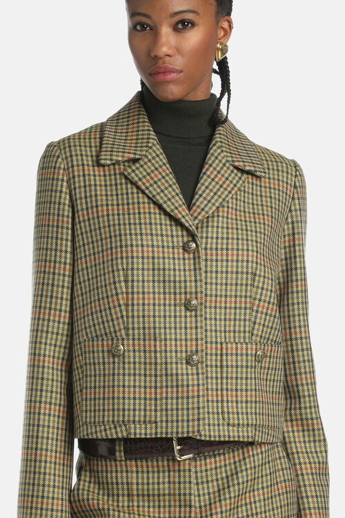 Cropped jacket with slightly oversized proportions, made from pure virgin wool. Features classic lapels, heraldic emblem buttons, and two patch pockets. Regular fit.