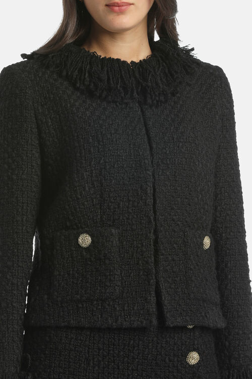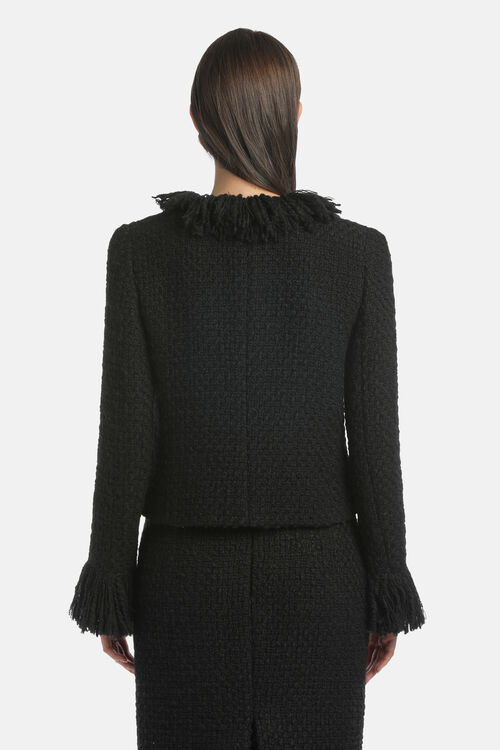 Bon ton jacket in bouclé wool blend, embellished with tonal fringe on the collar and cuffs. Invisible hook closure, flap pockets. Regular fit.
