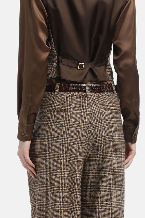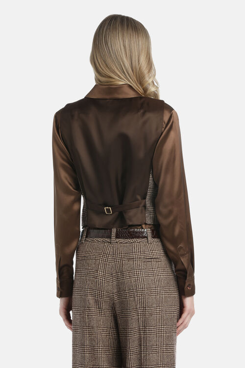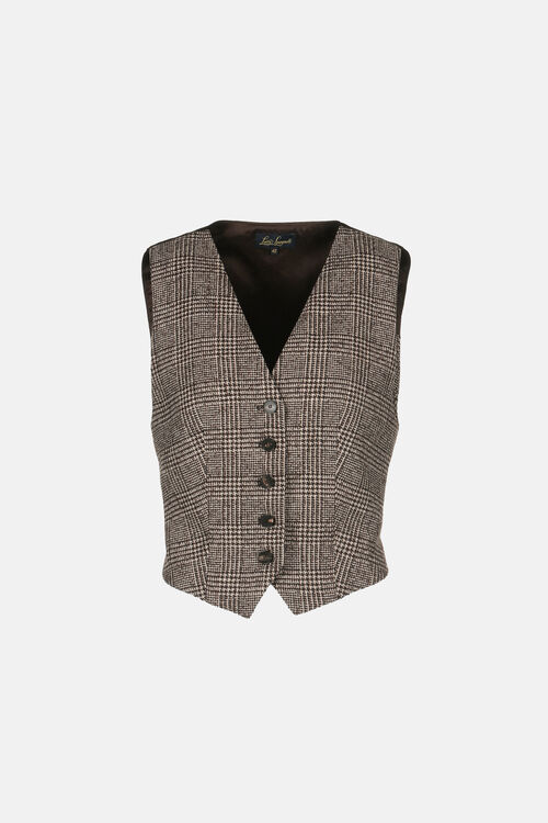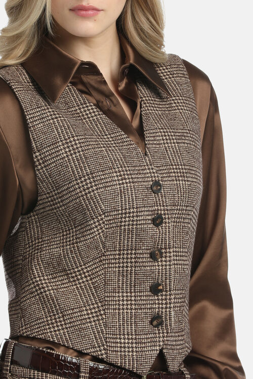 Houndstooth wool-blend vest with tortoiseshell-effect buttons. Features a front slit, satin back panel, and back martingale. Regular fit.