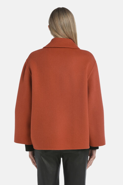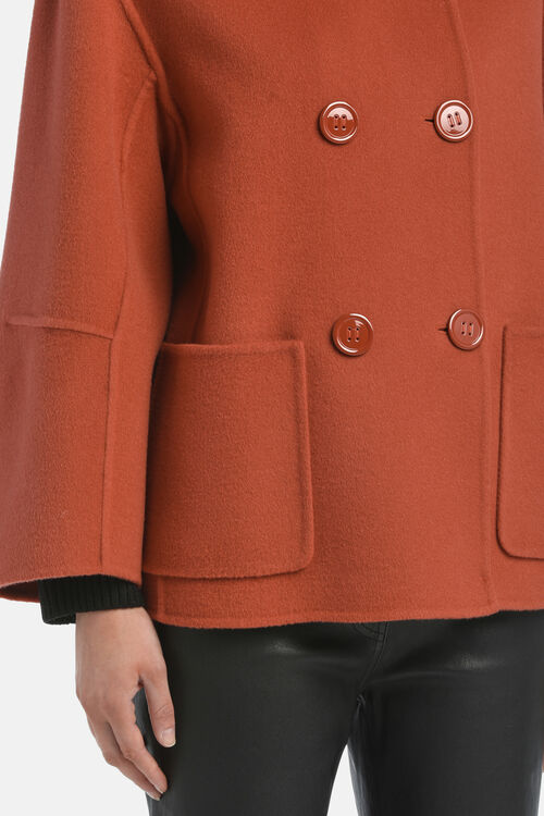 Wool jacket with a double-breasted silhouette. Features tone-on-tone buttons, patch pockets, and slightly flared sleeve hems. Dropped shoulders and matching-fabric intarsia at the sleeve ends. Regular fit.