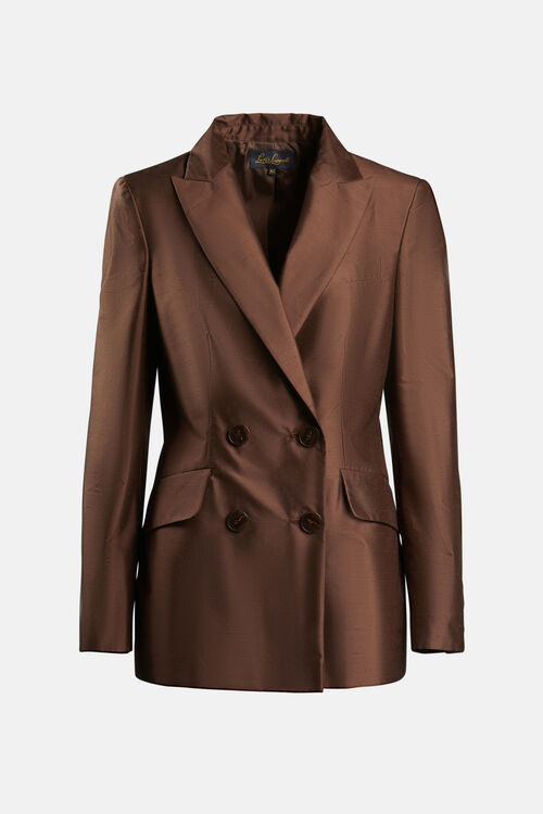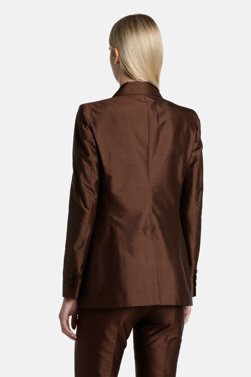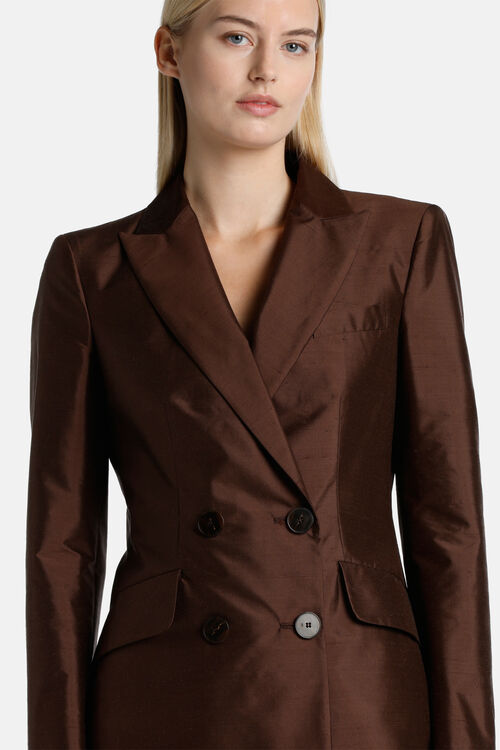 Elegant double-breasted blazer in shantung silk, fastens with four matching buttons. Featuring peak lapels, flap pockets, and a central slit in back. Regular fit.