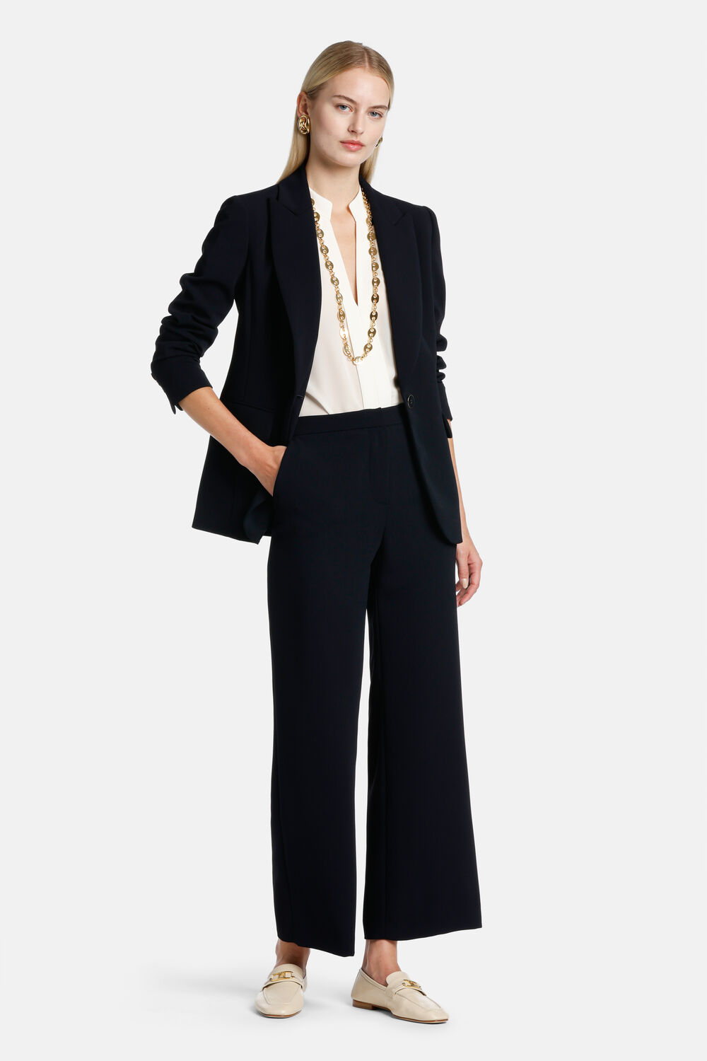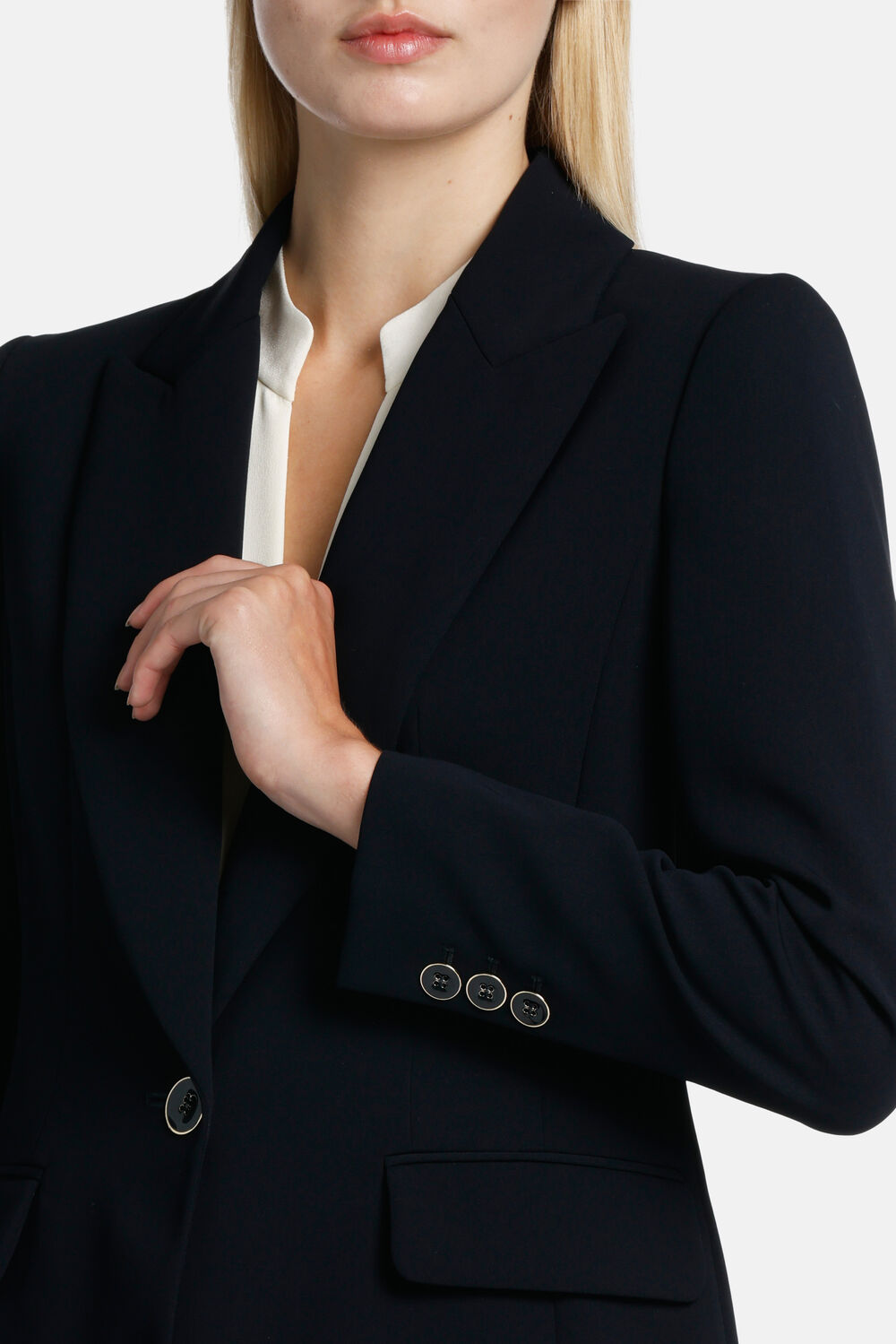 Blazer jacket with peak lapels, flap pockets, and a vent in back. Fastens with a single button. Regular fit.