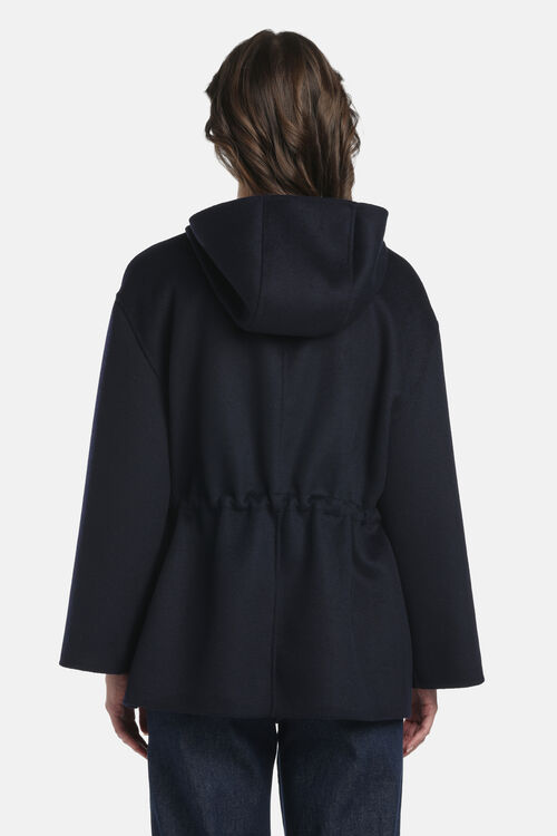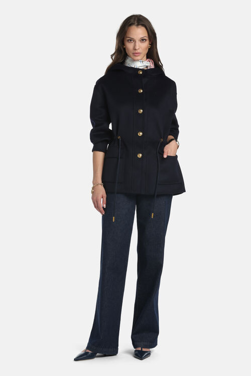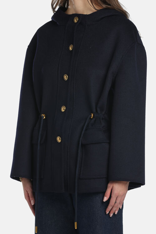 Wool-blend hooded Caban featuring a „LS“ heraldic button closure, flap pockets, and a drawstring waist with gold-tone metal tips. Regular fit.
