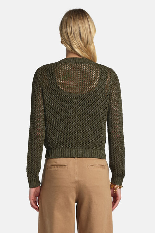 Openwork knit cardigan with lurex rib trims, a round neckline, gold-tone „LS“ flat buttons, and patch pockets with flaps. Cropped-in-length. Regular fit.
