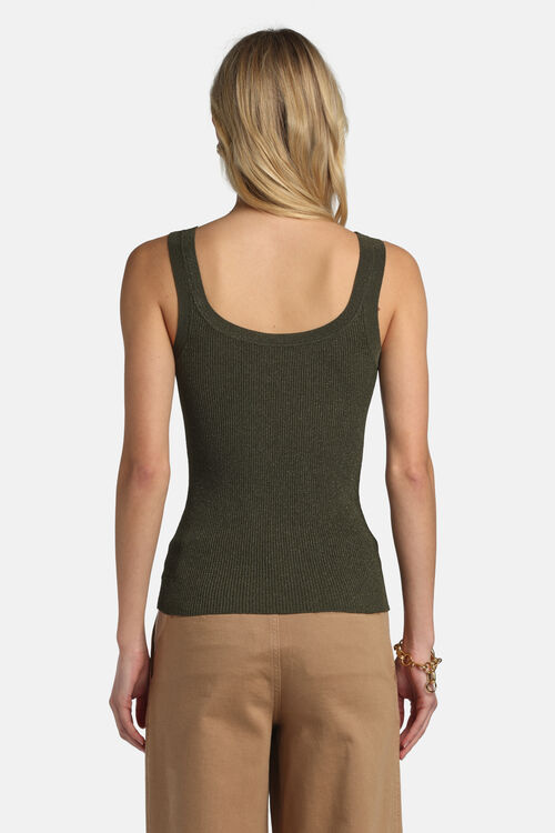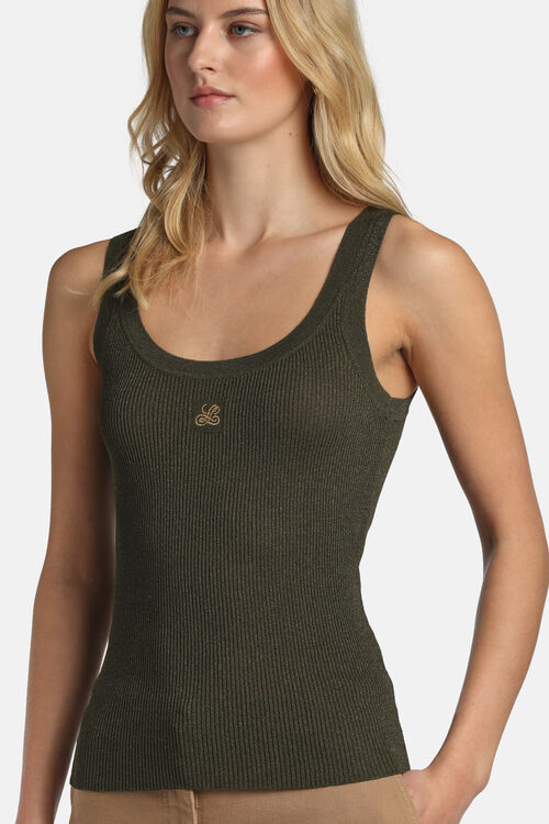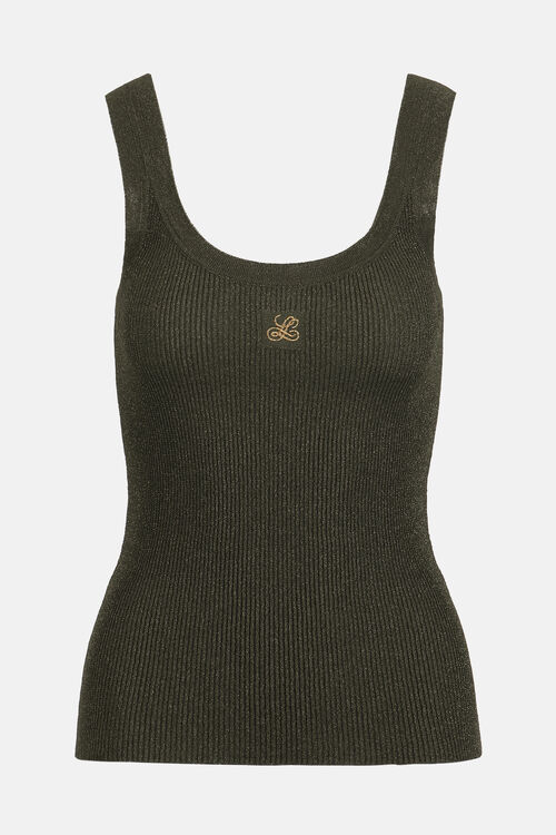 Sleeveless viscose-blend knit top illuminated with lurex threads, featuring a central script „LS“ embroidery, a wide round neckline at the front and back, and a striped pattern. Slim fit. Made in Italy.