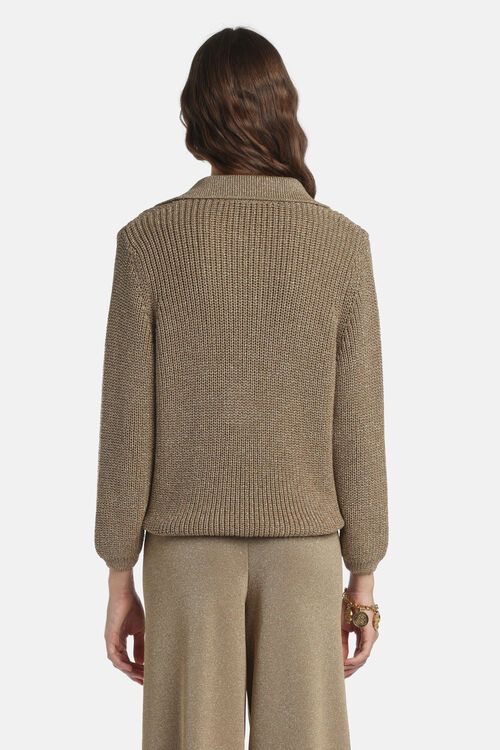 Viscose-blend and lurex knit pullover with a chunky-rib construction, a buttonless polo neckline, and dense ribbed-knit trims. Regular fit. Made in Italy.