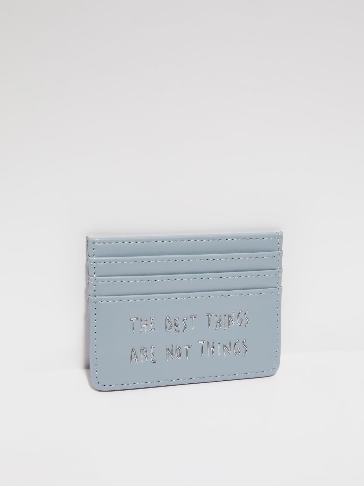Part of the 1-800 Gift Alert Co.llaboration with artist Pietro Terzini, this card holder comes with one of two playful, irreverent slogan prints across the front.