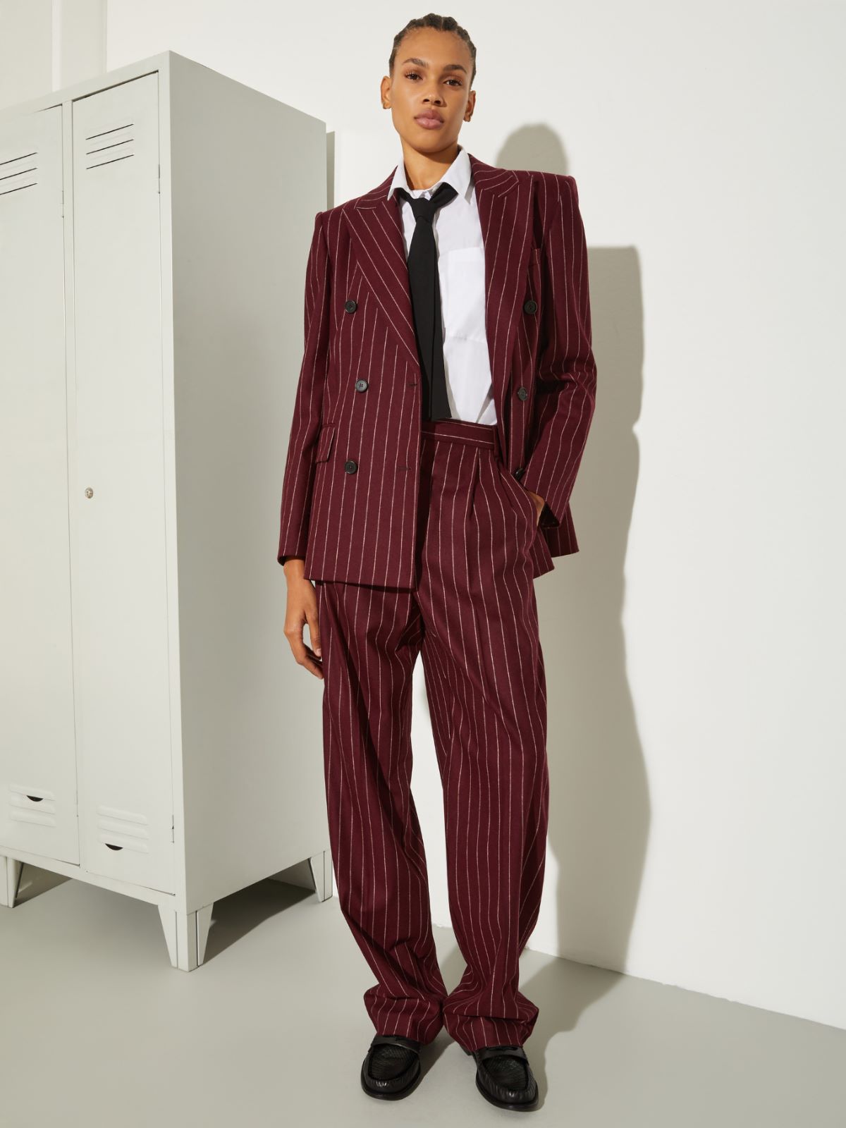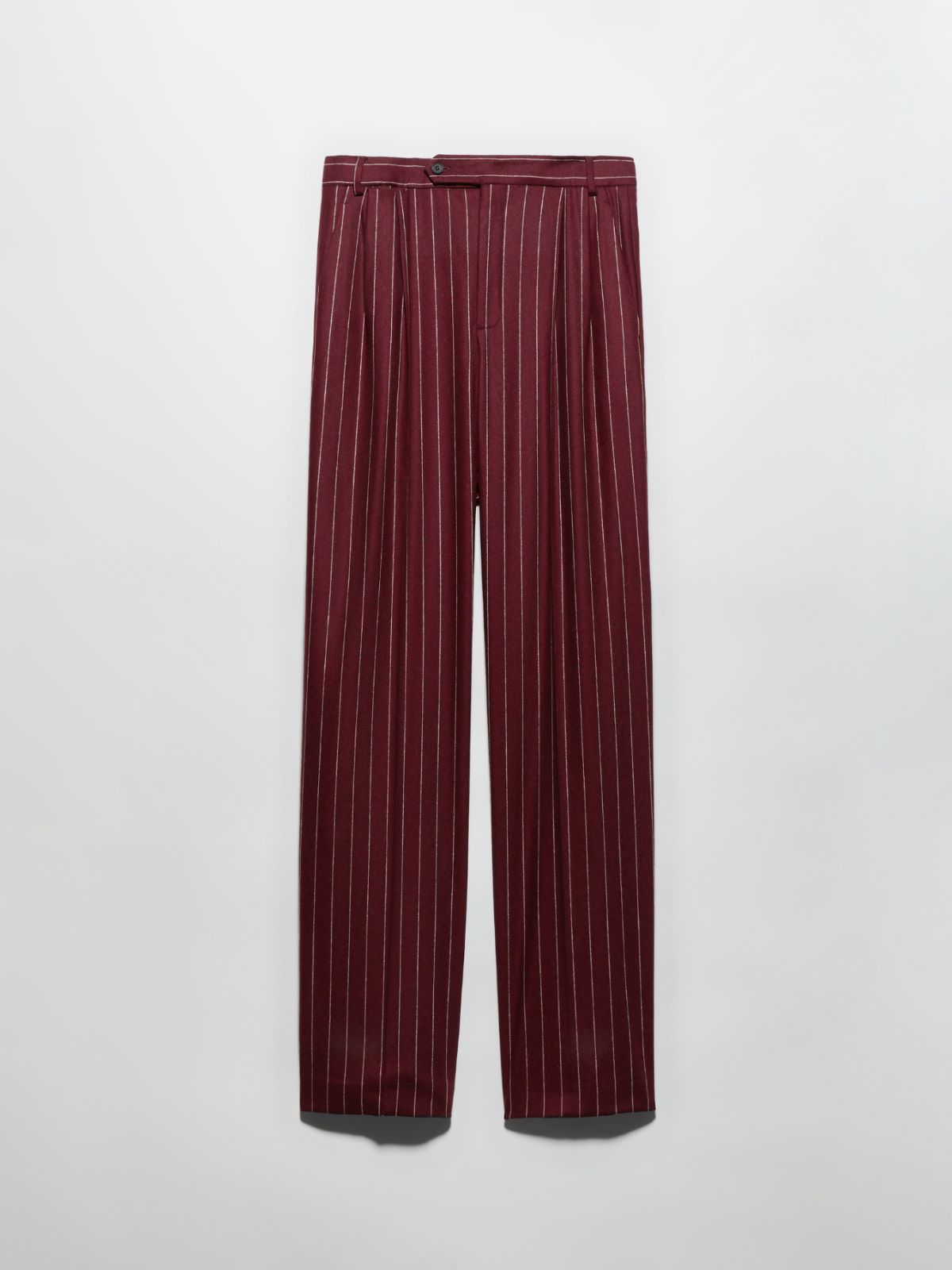 Part of Pietro Terzini’s Here We Go Again &Co.llaboration, these pinstriped trousers take cues from 1920s New York tailoring, brought up-to-date with an embroidered slogan across the back.