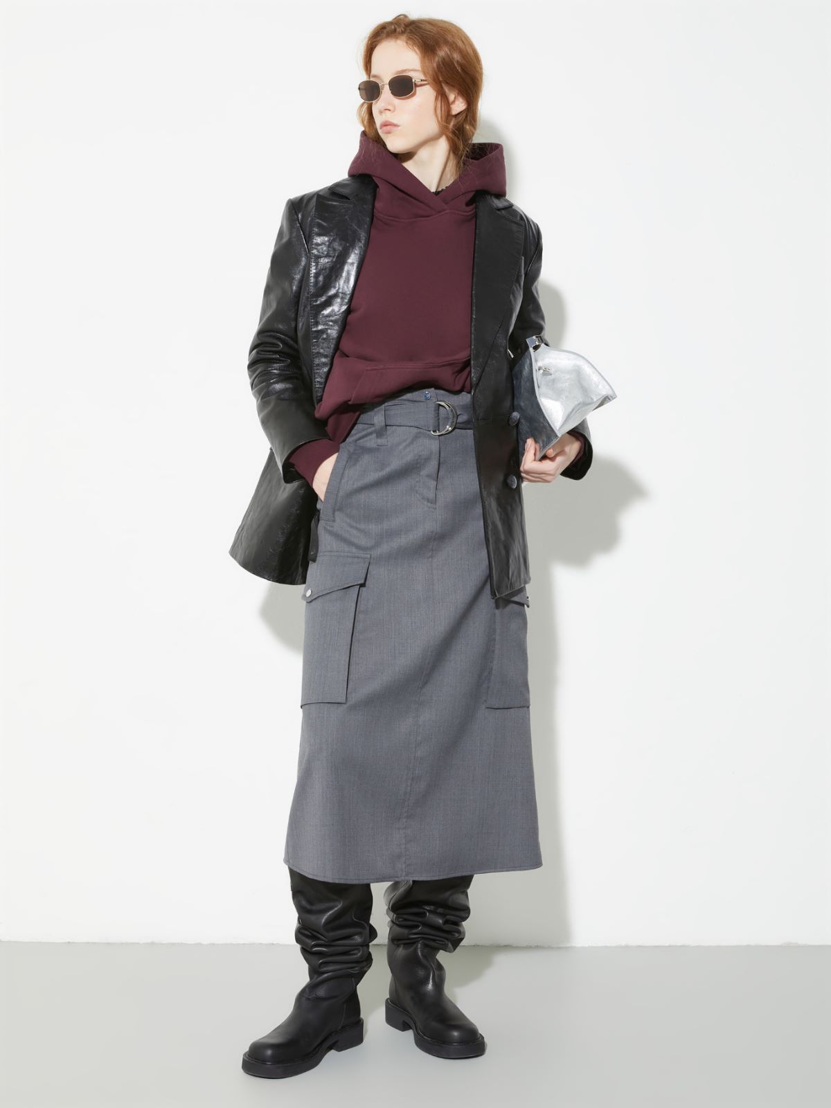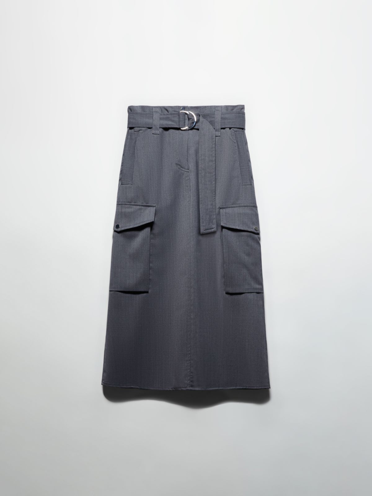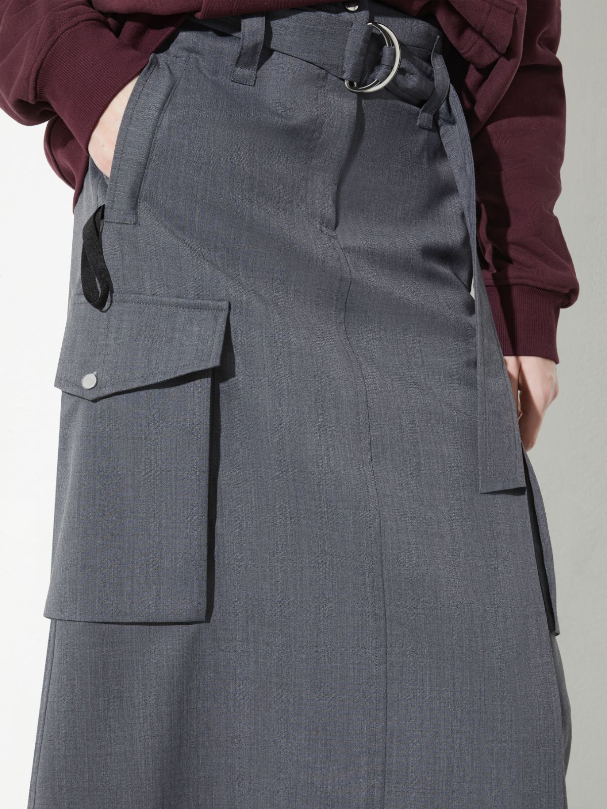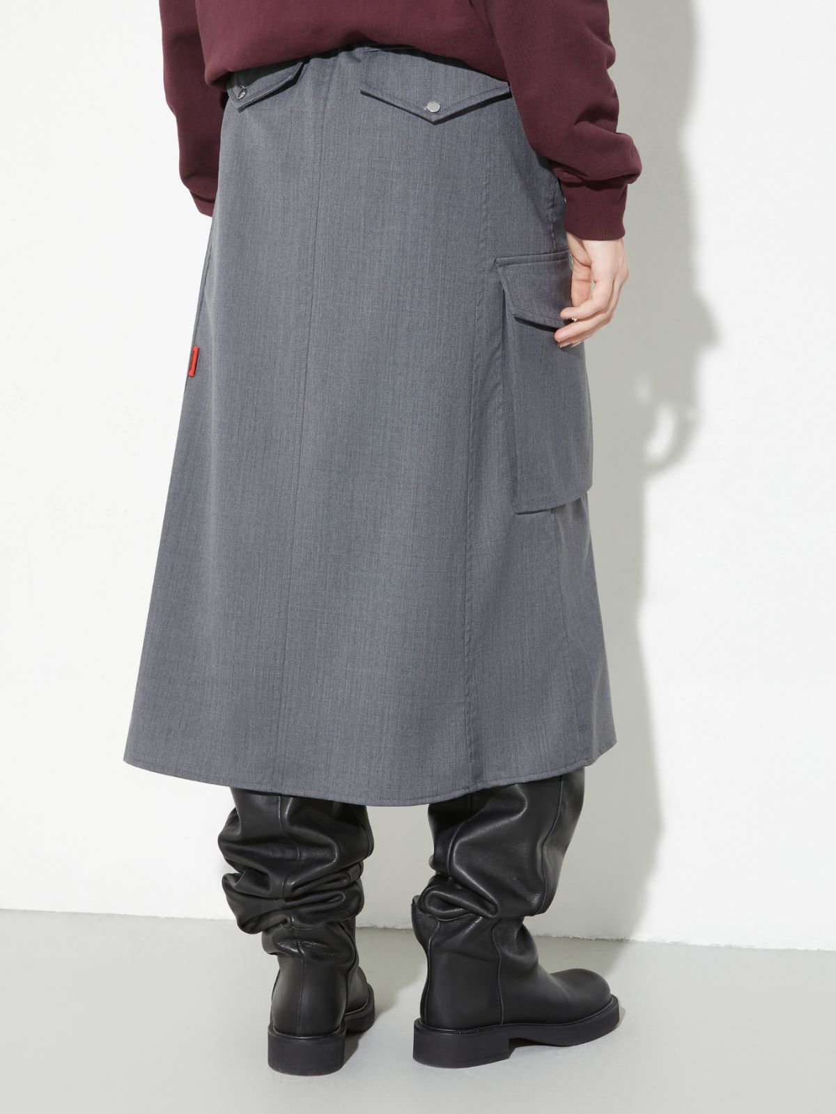 Crafted from a premium fabric by Italian textile manufacturer Marzotto, this skirt is part of the Sartorial Shifts capsule. Its midi, cargo-style silhouette is where tailoring meets streetwear.